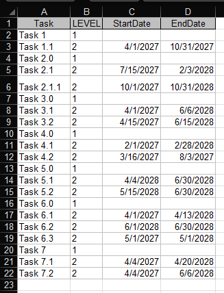 .SetOutlineLevel TaskNumber, Worksheets("Sheet2").Cells(TaskNumber + 1, 2).Value