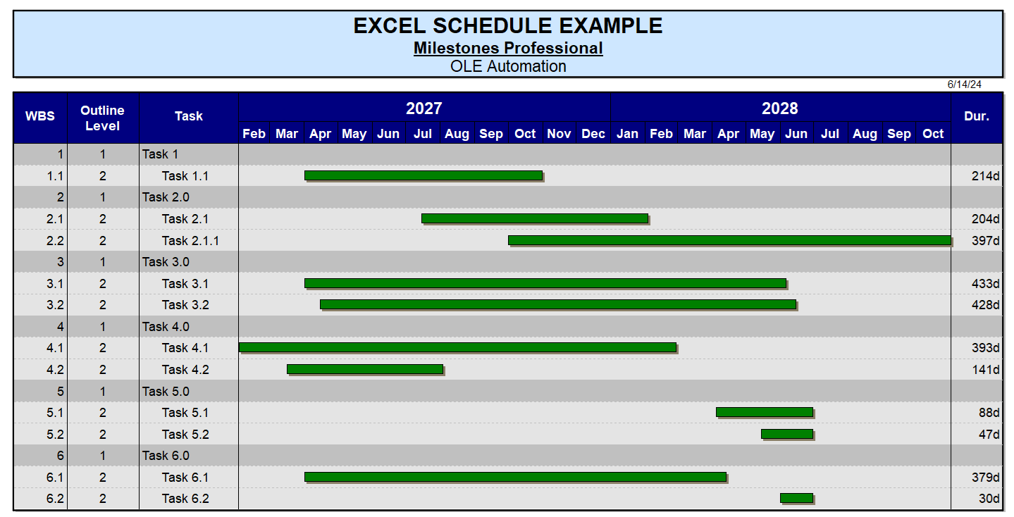 Here is a more advanced example of how you might use Milestones Professional’s OLE Automation interface with Excel.